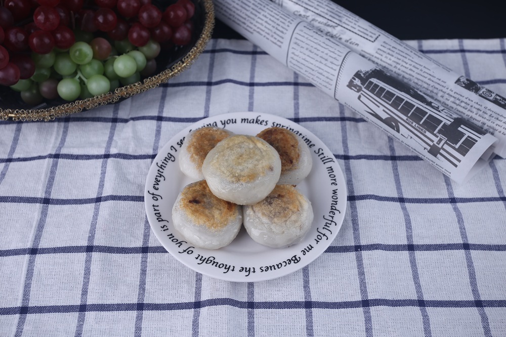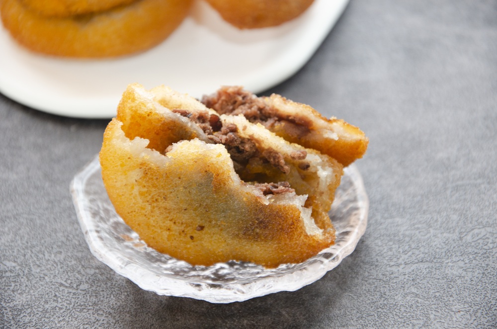 選用糯米粉和大米配比做皮,紅小豆入餡兒,在鍋里烙制兩面煎金黃,外殼微微酥脆,